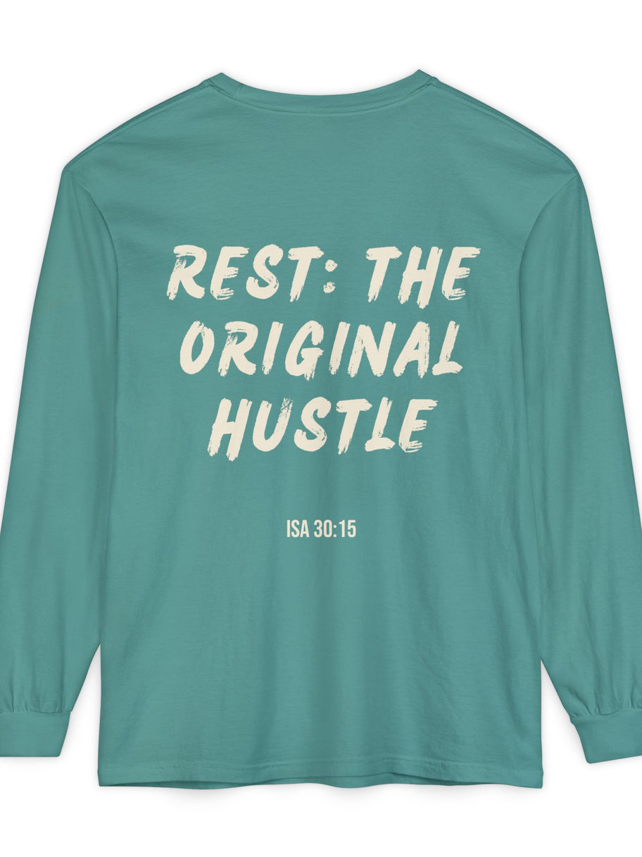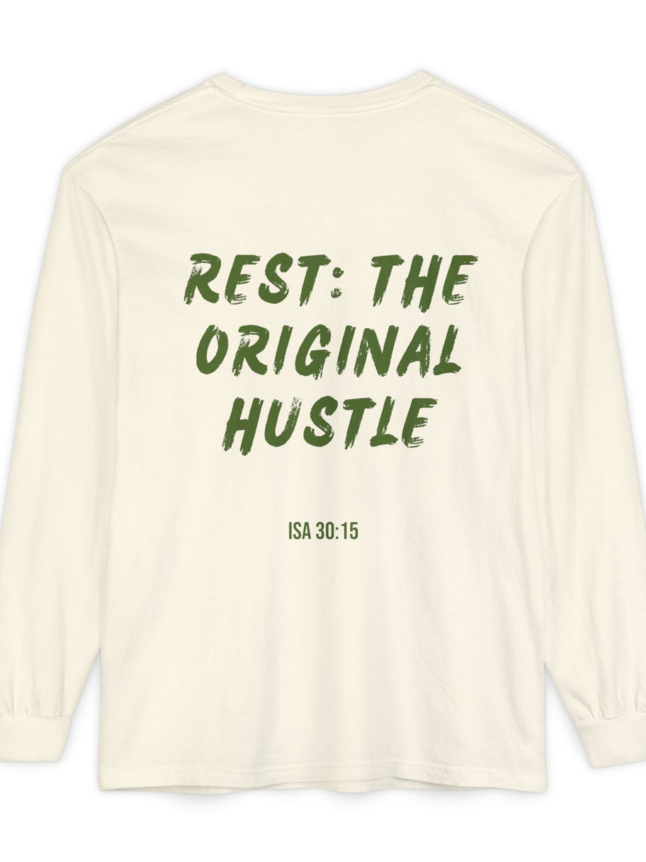 A long sleeve that flips the world’s hustle culture on its head. Inspired by Isaiah 30:15, it declares that true salvation and strength are found not in endless striving, but in repentance, rest, and trust.
